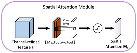 Spatial Attention Module: In Figure 6, spatial attention uses the channel-enhanced feature as the input feature. First, Global Max Pooling and Global Average Pooling are performed along the channel dimension to generate two single-channel statistical features and . Then, the two features are concatenated into along the channel dimension, and the channel information is fused through the 1D convolution kernel . Finally, the spatial attention weight map is normalized by the Sigmoid function. The formula is as follows: