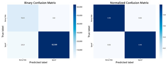 In order to further analyze the performance of the model on various samples, we introduce the confusion matrix as a supplementary evaluation indicator. In forged speech detection, two types of errors are usually of concern: false negatives (FNs), misclassifying forged speech as real speech, and false positives (FPs), misclassifying real speech as forged speech. Figure 8 shows the binary confusion matrix and the normalized confusion matrix. A total of 132 real speech samples were misclassified as forged speech, accounting for 1.79% of the real speech samples. This shows that the model has high specificity in recognizing real speech. A total of 1313 forged speech samples were misclassified as real speech, accounting for 2.06% of the forged speech samples. Figure 9 shows the classification performance of the model when facing unknown attack types. The model has perfect detection capabilities (100% accuracy) for attack types A07, A09, A11, A12, A13, and A14 and is close to perfect detection (>99% accuracy) for attack types A10, A15, and A19. It maintains excellent detection capabilities (>97% accuracy) for attack types A08, A16, and A18. Among the total FP samples, the number of missed detections for the A17 attack type is 1008, accounting for 76.77%. The A17 attack type (waveform filtering) is a voice conversion technology that changes the voice features by filtering the original voice waveform, directly operating on the time domain waveform to avoid modifying the spectral features. Our model has not yet achieved the optimal detection effect for this type of attack. This finding provides a useful reference for further model optimization. The confusion matrix reveals that the model still has a certain misjudgment rate on some forged samples, especially in low-quality forged samples (such as VC type), which is more likely to produce false negatives.