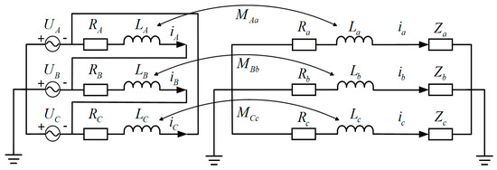 where Rload and Lload∈R3 × 3 consist of load impedance, R11 and R22∈R3 × 3 are diagonal matrices composed of the resistance of each phase on the primary winding and secondary winding, respectively, and L11, L22, L12, and L21∈R3 × 3 are the block array of inductance matrix including self-inductance and mutual inductance between the primary winding and secondary winding.
