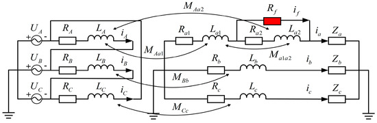 Figure 2 displays the equivalent circuit model in which the ISCF is assumed to be in the secondary winding of phase-a. In this model, the leakage impedance of each phase and the mutual inductance between the primary winding and the secondary windings are taken into account. The ISCF of winding can be modeled by adding an additional circuit, including contact resistance Rf to the faulty turns in phase-a, which simulates the degree of insulation deterioration. Otherwise, if is used to describe the circulating current of short-circuit turns. The original secondary winding is divided into a healthy part and a faulty part, which are, respectively, denoted by subscripts ‘’1” and “2”. The resistance matrix is extended to a fourth-order diagonal matrix as follows: