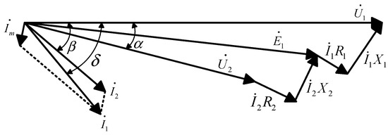 Assuming that load impedance ZL = RL + jXL is a resistive-inductive load, it can be concluded that the initial phase of the input current lags behind that of the input voltage, while the initial phase of the output current lags behind the output voltage. Therefore, the vector diagram corresponding to the single-phase equivalent circuit diagram can be obtained and presented in Figure 4.