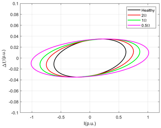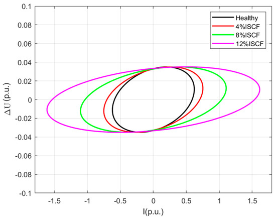 Figure 10 presents the ΔU-I locus curve under different shorted turn ratios, in which the fault resistance is always equal to 2Ω. The corresponding shorted turn ratio for a healthy transformer is zero. With the increase in shorted turn ratio, the ΔU-I ellipse curve rotates clockwise, and the slant angle θ decreases simultaneously. Meanwhile, the shape of the ellipse has changed significantly, and the length of its major axis has increased. The comparison results of slant angle θ and fault indicator FI versus different shorted turn ratios have been presented in Table 2. It is observed that variation in FI is greater than that of θ, which has a better diagnostic performance by setting a suitable threshold value.