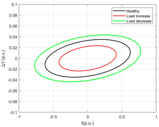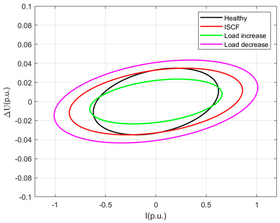 To prove the fault indicator is reliable under load fluctuations, Figure 12 presents the simulation results when the load of the transformer in a healthy condition increases and decreases. The ΔU-I ellipse curve is completely distinct from ISCF, which appears to have been proportionally enlarged or condensed. The relevant fault diagnosis indexes are given in Table 4. However, the FI is slightly varied when the load fluctuates, indicating that the proposed detection method is robust to most operating conditions.
