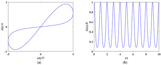 In order to prove the characteristics of memristors, the parameters are set as , . When the excitation signal is , the hysteresis loop of a memristor is simulated, where and represent the amplitude and frequency of the cosinoidal voltage input. Let and , the relationship between and is a hysteresis loop, and the variation in memristive conductance with are presented in Figure 2, which prove the basic memristive characteristics.