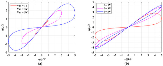 Considering the effects of amplitude and frequency of input cosinoidal voltage on the operating characteristics of the memristor, the two parameters are modified separately. First, with , and fixed, the amplitude is set to 1 V, 3 V, and 5 V, respectively. As shown in Figure 3a, the area enclosed by the hysteresis loop rises with the amplitude of the input signal. Then, with , is set to 1 Hz, 3 Hz, and 5 Hz, respectively. As the frequency increases, the area of the hysteresis loop diminishes and ultimately converges to a linear function, as depicted in Figure 3b. The simulation results presented in Figure 3 demonstrate that the hyperbolic tangent memristor exhibits the essential features of conventional memristor models.