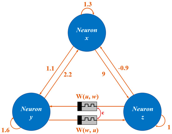 The memristor is a nonlinear circuit element whose resistance can vary in response to changes in current and voltage, which possesses a memory property, and is considered the fourth fundamental circuit component, in addition to resistance, capacitance, and inductance [4]. By regulating the voltage applied across the memristor, its resistance can be adjusted in a nonlinear and continuous manner. This resistance change is retained even after power is removed, corresponding, respectively, to the plasticity [5] and memorability [6] of synaptic weights, respectively [7]. In recent years, memristive neural networks have gained increasing prevalence [8,9,10,11]. Among them, the Hopfield neural network (HNN) [12] has emerged as a prominent artificial neural network, attracting substantial interest from scholars [13,14]. The ability of the HNN to stimulate complex dynamical behaviors observed in the brain, particularly chaotic phenomena, is largely due to its strong nonlinearity and flexible algebraic formulations. Leveraging the distinct advantages of memristors, researchers have developed memristive Hopfield neural networks (MHNNs) [13,14,15,16,17], which have been widely applied in diverse research areas such as associative memory, image processing, and combinatorial optimization [16,17,18,19,20].