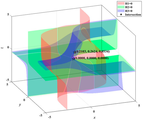 Let , , and be equal to zero, and setting , and , the three surfaces are shown in Figure 5. As can be visualized from the figure, there are two intersections in total, which are equilibriums of the system within the given parameters.