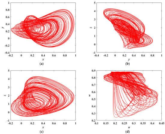 Phase portraits of MHNN: (a) x-y phase; (b) y-z phase; (c) x-z phase; (d) u-w phase.