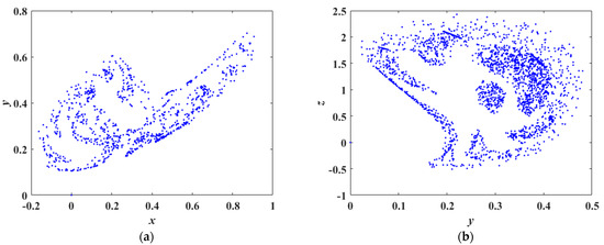 Figure 7 presents the Poincaré map in the x-y-z space with cross-sections defined by and , in which it can be seen that the points on the cross-section form a piece of discrete two-dimensional shapes, which indicates the existence of chaotic attractors.