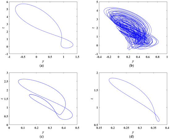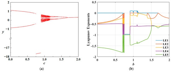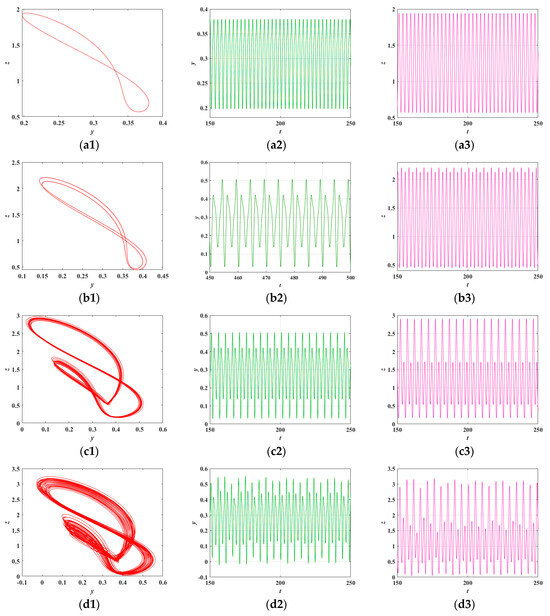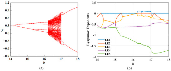 Figure 8 presents the bifurcation diagram in the y phase along with the corresponding Lyapunov exponent spectrum of the system. It can be observed that the dynamic behaviors revealed by both methods exhibit consistent trends. Specifically, as the parameter increases within the interval , the system maintains a stable fixed point. When reaches 14.26, the first periodic bifurcation occurs, during which the system undergoes a supercritical Andronov–Hopf bifurcation and transitions into a period-1 oscillatory state. As b continues to increase, the system experiences a second bifurcation at , entering a period-2 oscillatory state. Subsequently, within the interval , the number of branches in the bifurcation diagram increases significantly and becomes densely distributed, indicating that the system gradually transitions from a quasi-periodic state to a chaotic state. Finally, at , the system undergoes a sudden transition from chaos back to a periodic oscillatory state.