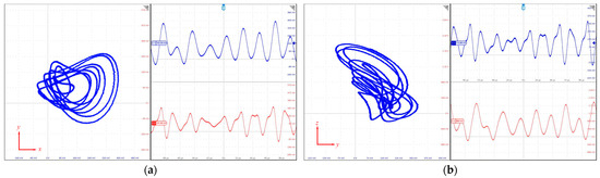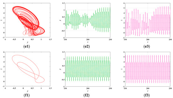 By numerically simulating the time evolution of the system, the trajectories of the state variables can be plotted and the system’s dynamic behaviors can be examined. For Equations (3) and (5), the parameters are set as , and with the initial conditions defined as . The chaotic behaviors of the system under the given conditions are, respectively, illustrated in the subplots of Figure 6.