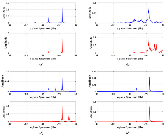 To examine the signal spectrum under various crosstalk strengths, the Fast Fourier Transform (FFT) algorithm is employed. The frequency-domain signal characteristics of the system for different values of the parameter , corresponding to , , and , are presented in Figure 12. Each subfigure contains the amplitude response curves of the y phase and z phase. The analysis results show that for all values of the parameter , the amplitude responses of both y phase and z phase show significant peaks in the mid-frequency band (about 49.6 Hz), indicating that the system has a strong response at this frequency. However, with the increase in parameter , the amplitude response of y phase and z phase decreased. This indicates that the parameter has a significant effect on the frequency response characteristics of the system, especially on the response strength in the middle frequency band.