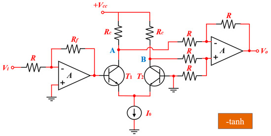 where refers to the thermal voltage of the transistor, typically a value of 26 mV at room temperature. The corresponding parameters are configured as , , , and . Notice that the circuit realizes the ‘tanh(.)’ hyperbolic tangent function when nodes A and B are interchanged.
