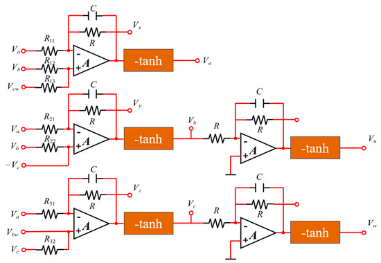 Referring to [28,29], the analog circuit used to realize the MHNN model in Equation (5) is constructed and implemented.