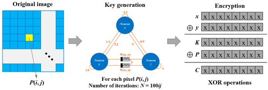 The encryption process is implemented based on the key matrix generated in Equation (26). When encrypting, each pixel of the plaintext is subjected to a pixel-wise XOR operation with the corresponding element of the key matrix , which can be expressed as