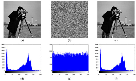 Image encryption and histogram analysis: (a) Original image; (b) encrypted image; (c) decrypted image; (d) histogram of the original image; (e) histogram of the encrypted image; (f) histogram of the decrypted image.