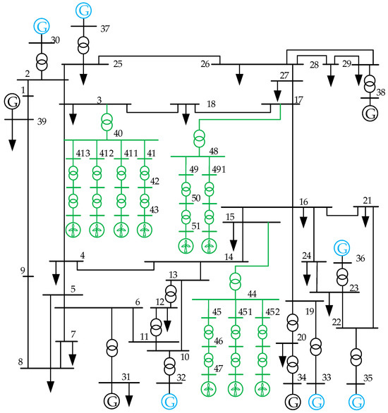 The short-circuit ratio at the machine end of the new energy field station (nodes 43, 47, 51) and the short-circuit ratio at the grid-connected point (nodes 41, 45, 49) when the thermal power unit at node 37 is in synchronous condenser operation were calculated, and the specific data are shown in