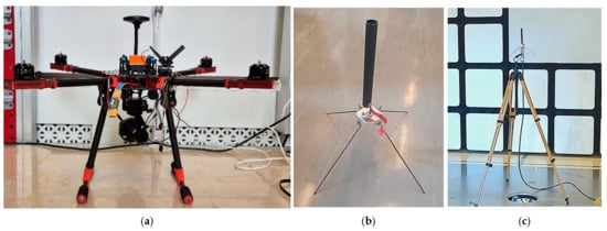 UAV platform used in experiments. The drone (a), carbon-fiber monopole antenna element (b), and the antenna mounted on a tripod with feeder cable connection (c).