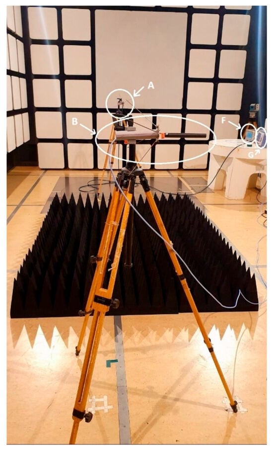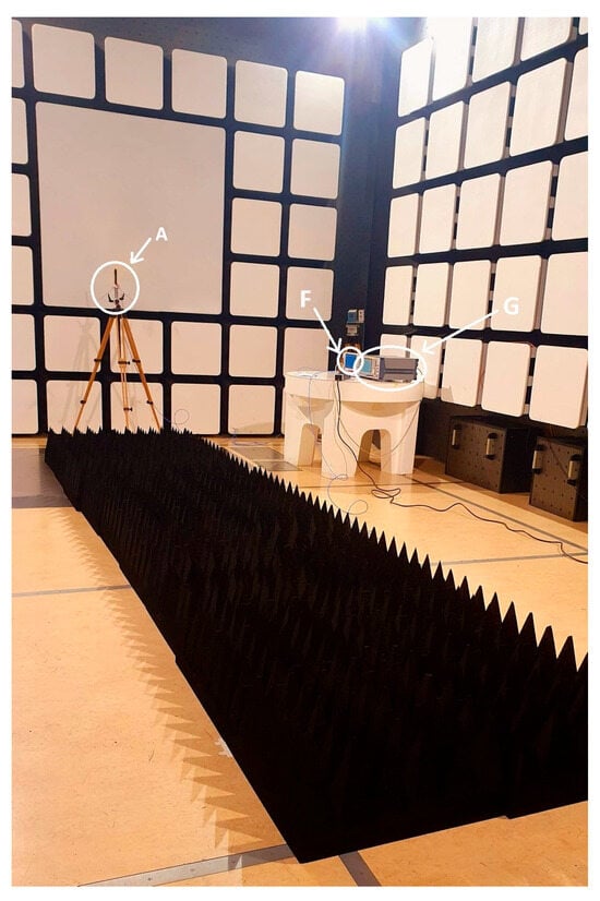 The anechoic chamber used in experiments where A—Antenna A; F—Oscilloscope and G—Signal generator.