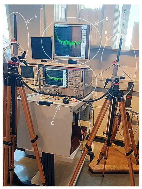 Reflection coefficient setup, where A—Antenna A; B—Antenna B; C—Vector Network Analyzer and D—Display monitor.