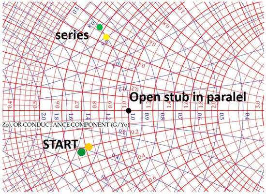 The next step in the impedance matching procedure is to add an open stub in parallel. This corresponds to moving from the light green point to the center (black point) of the Smith Chart. The length of the parallel stub is determined by: