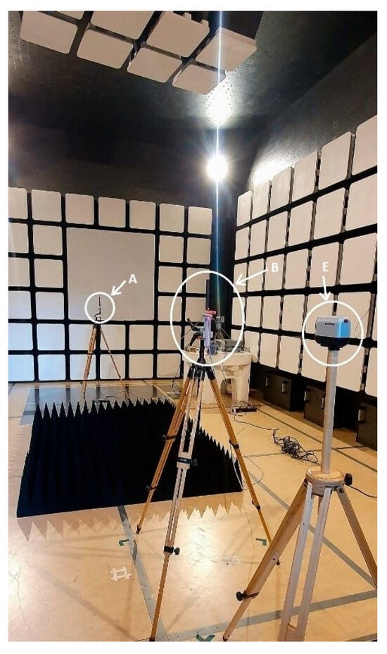 Radiation pattern setup, where A—Antenna A; B—Antenna B and E—Alignment laser.