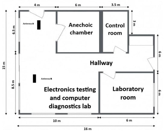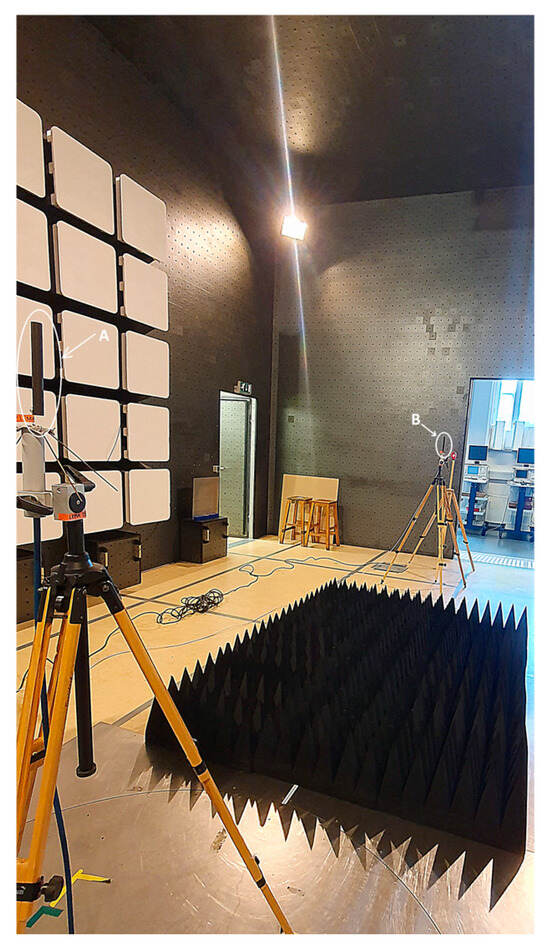 The initial configuration involved placing the antennas at a distance of seven meters, with black absorbers strategically positioned on the floor to minimize reflections, as shown in Figure 8. Subsequent measurements were conducted by progressively bringing the antennas closer together after each iteration.