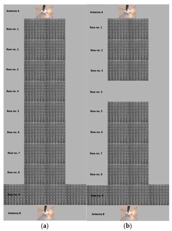 For these measurements, gaps were added and repositioned between the absorbers to create multiple signal propagation paths. The varying positions of these gaps influence the phase relationships between the received signals, highlighting the impact of multipath propagation on the received signal strength. The antenna shown at the top of Figure 10 is the transmitting antenna. In the Figure 10b, a gap is illustrated at position 4.