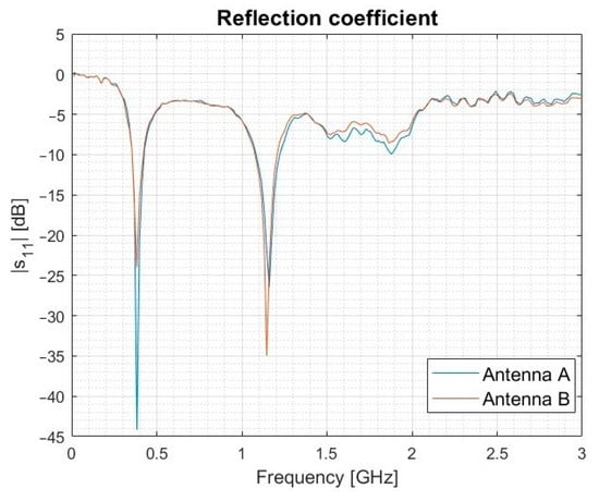 As a result of the experiment, the curve of the reflection coefficient as a function of frequency was plotted for both antennas, as shown in Figure 12.