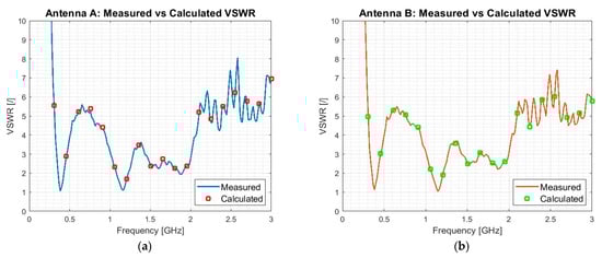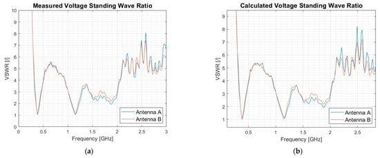 The tests conducted on the antennas included the analysis of the reflection coefficient and the Voltage Standing Wave Ratio (VSWR). The variation of the reflection coefficient was evaluated over the frequency range of 10 MHz to 3 GHz, and the VSWR values were experimentally determined using the VNA.