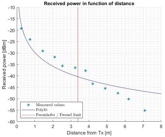 Due to limited precision in distance measurement, errors on the order of 0.01 m may occur. A second-order polynomial fit of the experimental data confirms that power is inversely proportional to the square of the distance from the transmitting antenna. However, the fit is not perfect, suggesting the influence of additional factors such as surface reflections or interference in the test environment.