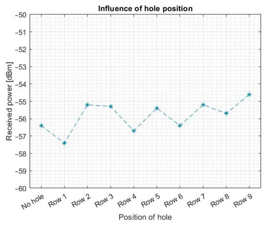 Figure 20 shows the influence of the position of a single hole in the absorber arrangement on the received power level. The horizontal axis indicates the position (from “No hole” to “Row 9”), while the vertical axis represents the received power in dBm. It can be observed that the presence of a hole consistently decreases the received power compared to the case with no hole at all. However, the exact position of the hole matters, with Row 1 and Row 4 producing the lowest power values (around –57.5 to –58 dBm), suggesting stronger destructive interference due to multipath effects at those positions. In contrast, holes in Row 2, Row 5, and Row 7 resulted in higher received power, closer to −55 dBm, implying more constructive interference or a lesser impact of reflection phase shift at those locations. The relative difference between the highest and lowest received power values is 5.13%, highlighting the measurable impact that even small changes in absorber configuration can have on signal strength. These fluctuations underscore how signal phase interactions and wave propagation paths are highly sensitive to spatial changes in the environment.