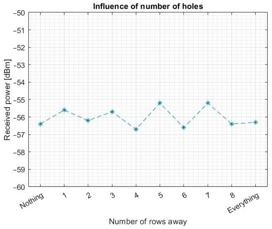 Figure 21 evaluates the influence of the number of holes (i.e., signal paths created) on the received power. The x-axis shows the number of open rows (holes) introduced, from 1 to 8, including the “Nothing” (fully covered) and “Everything” (all rows open) cases. The variation in received power is generally minor, staying between −55.5 dBm and −57.5 dBm, but there is a clear trend of increased signal fluctuation with more holes, consistent with multipath fading effects. Interestingly, opening all rows (“Everything”) did not result in the maximum loss, which indicates that signal components might partially reinforce depending on their phase. Still, setups with intermediate numbers of holes (e.g., 4 or 6) caused more significant signal drops, again illustrating that destructive interference is not necessarily proportional to the number of paths but rather their relative phase alignment. As also observed in the previous graph, Figure 17, small structural or spatial changes can lead to measurable effects in signal reception. In this case, the relative difference between the highest and lowest received power is 2.72%, emphasizing the sensitivity of the system to environmental symmetry and wave superposition.