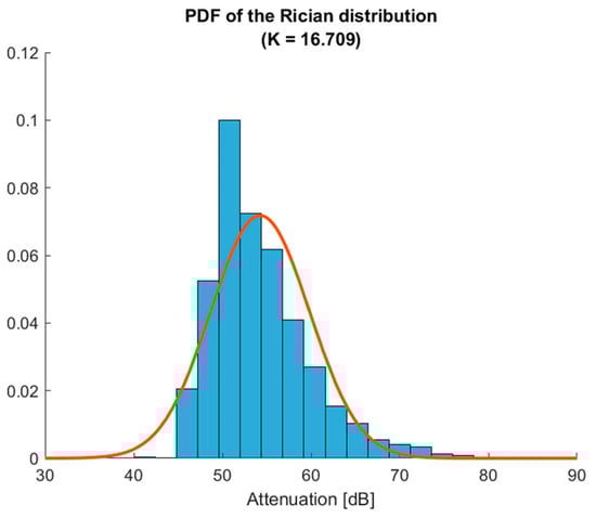 which quantifies the ratio of direct-path power to scattered-path power. In our dataset, we first constructed a normalized histogram of the measured attenuation (in dB) at 5 m to visualize the empirical distribution. We then performed a maximum-likelihood fit of a Rician pdf to those samples, as shown in Figure 24.