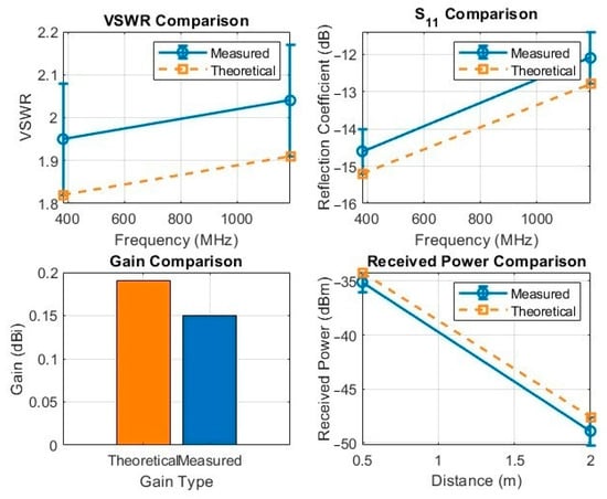 As can be seen in the graphs above, the following observations can be made: VSWR Comparison (Top-Left Plot): The blue circles with error bars represent the measured VSWR values, while the dashed line with squares represents the theoretical values at 381.45 MHz and 1.19 GHz. The error bars show a slight deviation, with the measured values being slightly higher than the theoretical ones, which suggests minor impedance mismatches or environmental factors affecting the antenna performance. The difference is small, meaning the VSWR remains within an acceptable range for practical applications.