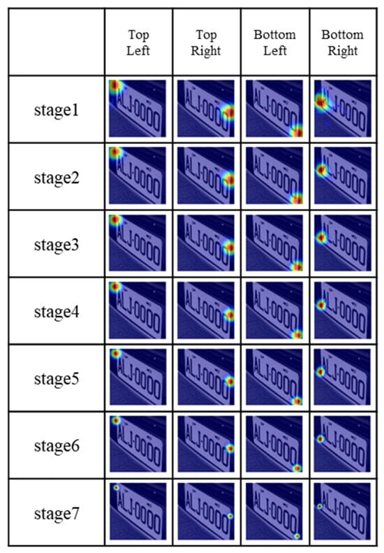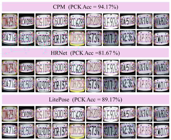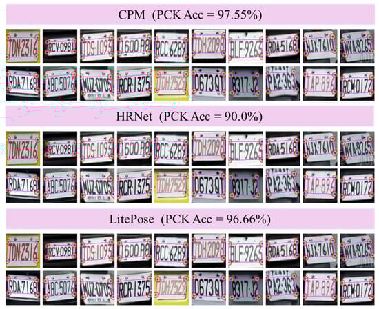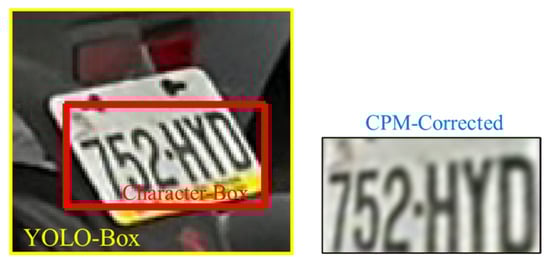 - Baseline model: The unaligned license plate test data from the TLPD dataset with basic data transformation (cropping) were directly utilized to test the modified LPRNet, resulting in 88.33% accuracy. The test data, consisting of images from the YOLOv4-tiny bounding box (YOLO-Box), were cropped to obtain the rectangular character region (Character-Box). In this instance, CPM was used to identify the rectangle’s four corners, as shown in Figure 12. Note that the plate images in the Character-Box were further transformed using perspective to obtain the corrected plate images (CPM-Corrected).