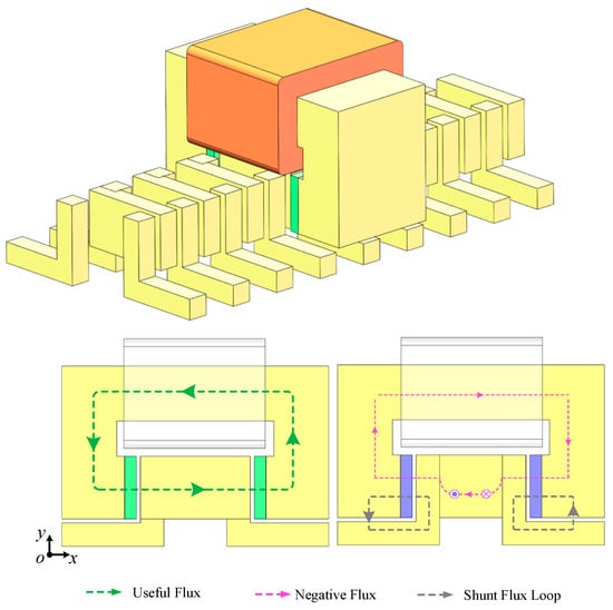 As mentioned in the related literature, the serious flux leakage phenomenon in the transverse flux machines is a key factor that limits the further improvement in the thrust/torque density in this type of motor. The leakage flux could be separated into several components by distinguishing between different flux loops. In the existing TF-FRLM, the first leakage flux component is the negative flux excited by the ‘unused’ PMs, which is linked with the coil and closed up in the opposite direction of the positive flux loop, as the pink lines shown in Figure 1. The second component is the direct leakage flux between the adjacent PMs along the motion direction, which does not link with the coil, as the gray lines show in Figure 1.