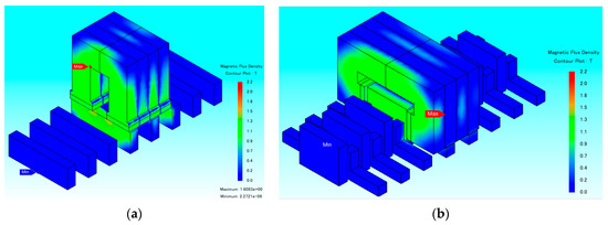 Three-dimensional FEM contour plot of the magnetic flux density of the TF-FRLMs. (a) Original one. (b) Improved one.