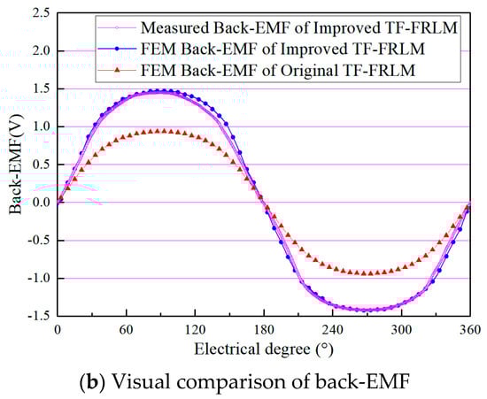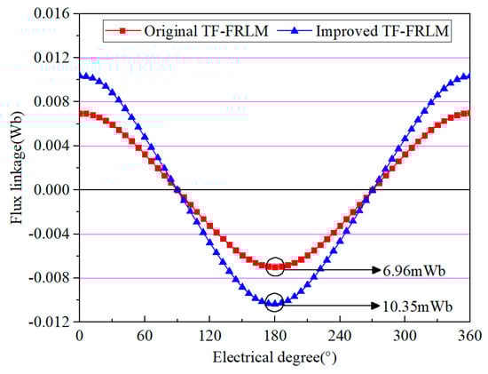 The results of PM flux linkage in the winding are shown in Figure 4, and the amplitude of the PM flux linkage in the original U-shaped TF-FRLM and the improved TF-FRLM is 6.96 mWb and 10.35 mWb, respectively. It is shown that the improvement in the PM flux linkage is nearly 48.7%. Since the total usage volume of PMs is equal in the two machines, the effect of the PM flux linkage improvement is significant.