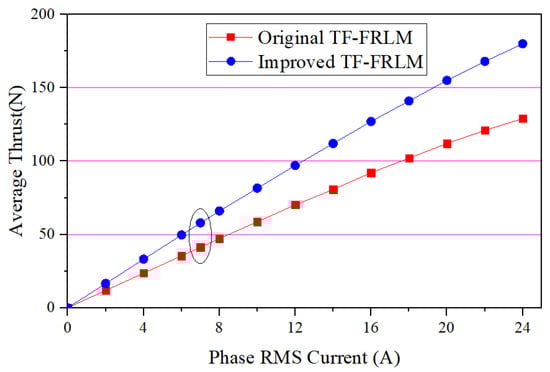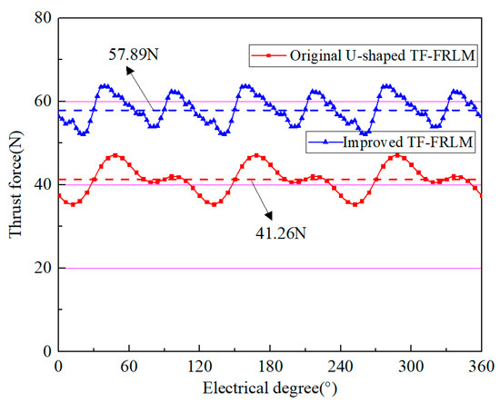When the ideal three-phase alternating sinusoidal currents are applied to the TF-FRLMs under the common Id = 0 control method, the results of the ideal thrust force are shown in Figure 5. The average value of the thrust force of the enhanced motor is 57.89 N, and the average thrust force of the original machine is 41.26 N. It can be seen that the improvement in the thrust force is 40.3% after the structure amelioration; the enhancement of the thrust force is also significant. This phenomenon is quite exciting and meaningful.