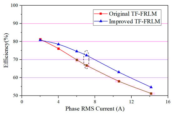Meanwhile, the efficiency and overload capability are simulated and compared as shown in Figure 6 and Figure 7. Both the TF-FRLMs have good overload capacity; they can provide nearly 2.9 times the overload thrust under triple-excited current. Since the improved TF-FRLM has a larger thrust than the original one, the efficiency is synchronously higher under the same operation speed, and the efficiencies of both motors decrease when the phase current is increased.