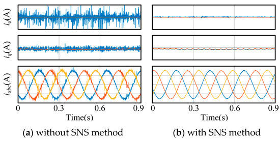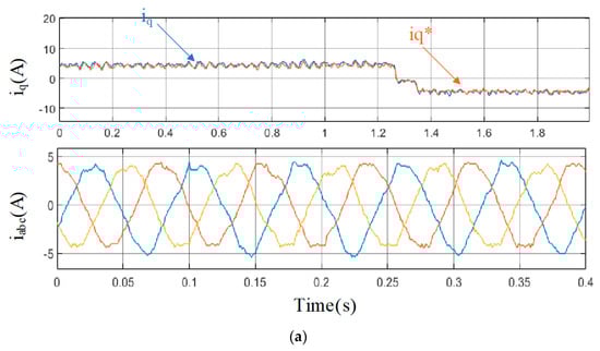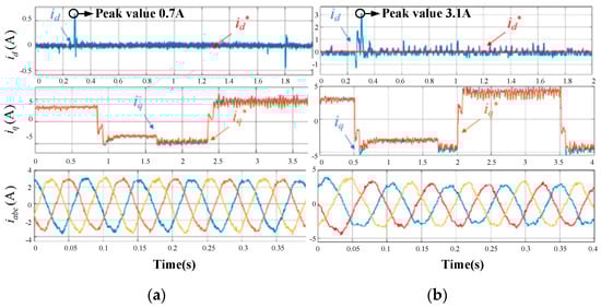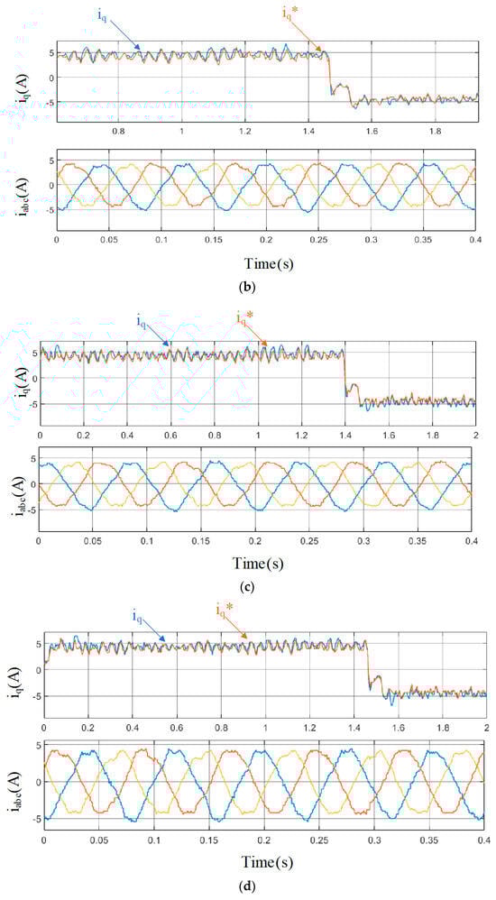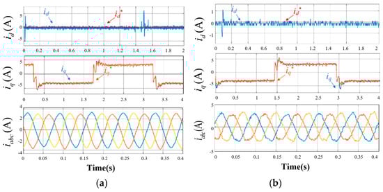 Compared between the traditional MFPCC method and the proposed MFPCC method, it can be seen that after the load stepping, there is a significant oscillation in the d-axis current; meanwhile, the tracking error in the d-axis current when using the traditional MFPCC is larger. The peak d-axis current under the traditional MFPCC method reached nearly 3.1 A, which makes sampling noise much larger. For the q-axis current, a significant oscillation can be seen in Figure 16, especially while reversing the direction. However, the significant oscillation in the traditional MFPCC method is much larger than the significant oscillation in the proposed MFPCC method, which means faster tracking and higher efficiency under the proposed control method. For the three-phase current iabc, there is a larger significant oscillation in the method of the proposed MFPCC, while it is still better than the method of the traditional MFPCC, with a smoother waveform. Based on the above dynamic-state experimental results, compared to existing MFPCC technologies, the proposed MFPCC achieves a better current performance, thus achieving the suppression of sampling noise.
