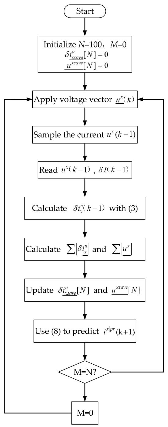 The control flowchart of the proposed MFPCC in the digital system implementation is shown in Figure 11, which can be mainly divided into four stages. The first stage is the preparation phase, which includes initializing variables, sampling stator currents, and reading voltages and in chronological order. Then, the natural response component and forced response component of the current variation are calculated based on the proposed adaptive strategy. Moving on to the third stage, CVPUUs with sampling noise suppression are calculated. Finally, according to the principle of MFPCC, the reference voltage vector for the next control period is predicted.