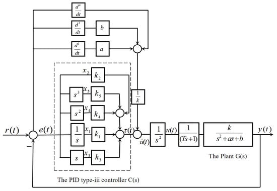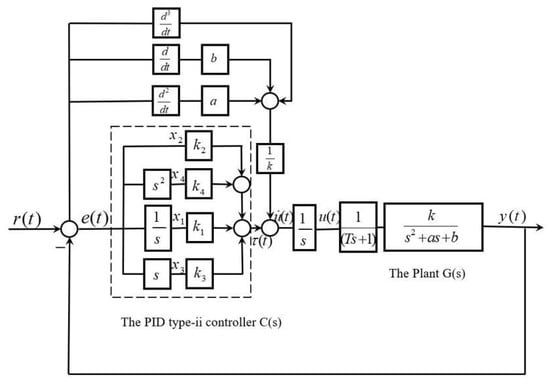 With the development of control theory, optimal control theories such as linear quadratic regulator (LQR), sliding mode control and high-type control have provided new approaches for addressing control problems in uncertain complex systems [,,]. It is worth noting that linear optimal controllers among these methods are predominantly designed using the LQR approach. This approach can effectively handle system uncertainties and external disturbances, designing optimal control strategies based on system states and objective functions to achieve precise control of the plant [,]. However, when dealing with multi-constraint problems, the traditional LQR method relies on an accurate system model and has limited capability to handle multiple constraints. Especially when the constraints are in the form of nonlinearities or inequalities, they are difficult to integrate directly into the optimization framework. This may cause the solution to deviate from practical requirements or fail to satisfy the constraints. Additionally, the closed-loop gain matrix of LQR is obtained by solving the algebraic Riccati equation, a process that exhibits high computational complexity in high-dimensional systems and is sensitive to model parameter perturbations, resulting in insufficient robustness []. The high-type control enhances the system’s type by adding integral links, thereby improving the system’s tracking ability and disturbance rejection ability [,]. Currently, the vast majority of research on high-type control focuses on the frequency-domain design of the system, ignoring the requirements in the time-domain. Although the high-type control method can strengthen the system’s tracking and disturbance rejection capabilities, the tuning of its controller parameters has always been challenging in both the academic and engineering fields.