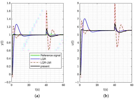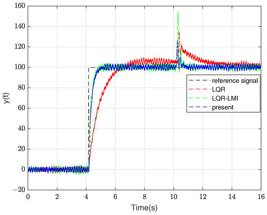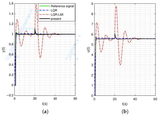 Figure 4b shows the response of the controller by different methods under external disturbance at t = 20 s. It can be seen that the response of the controller under the proposed method is better than that of the LQR-LMI method and the response of the controller under the LQR method. Meanwhile, the response of the controller under the method in this paper conforms to the maximum input amplitude of controller that we initially set as 10.