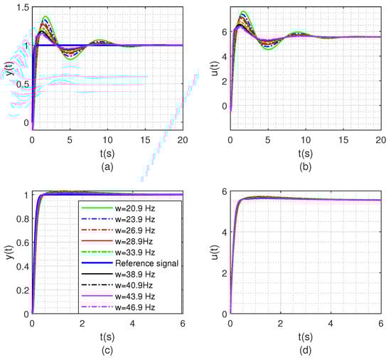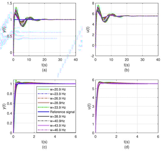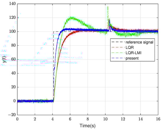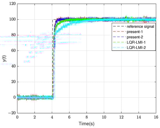 In the above PID type-ii control loop, the poles of the closed-loop system controlled by the proposed method are . To illustrate the role of the polyhedral model theory, by changing the natural frequency of plants, the control effects of the method proposed in this paper and the LQR-LMI method were compared, as shown in Figure 5. In this study, the natural frequency variation interval of the plant, such as Equation (37), is set as and varies within the range of 33.9 Hz.