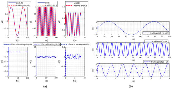Figure 6a shows the tracking response and tracking error of sin(0.1t), sin(t) and sin(10t) under the proposed method. In Figure 6a, the red curve represents the tracking of the reference signal using the proposed method. The sinusoidal instruction signals, such as sin(0.1t), sin(t) and sin(10t), can be effectively tracked by using the proposed method. Meanwhile, the error of the system tracking sin(0.1t), sin(t) and sin(10t) instruction signals is very small. Figure 6b shows the controller response of sin(0.1t), sin(t) and sin(10t) under the proposed method. The limit value of controller response meets and the maximum input amplitude of controller is in line with our initial setting of 10.
