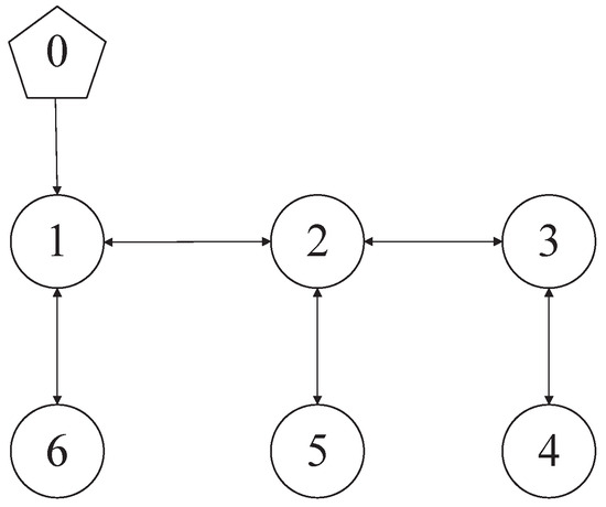 A heterogeneous nonlinear MAS comprising seven agents is considered, with the communication topology illustrated in Figure 1. The dynamic models of the followers and the leader are given by the MASs in (1) and (2) with , and