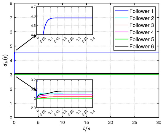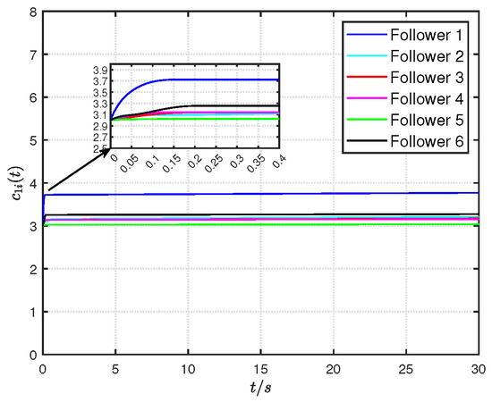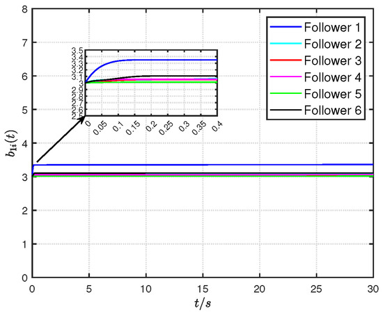 where , . Select , and in the distributed adaptive control protocol (5) to demonstrate Theorem 1.