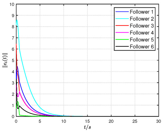 The adaptive robust TVFT control protocol is designed to handle inherent challenges of heterogeneous nonlinear MASs, particularly when the leader’s input is unknown. The protocol employs Lyapunov theory to guarantee system stability and robustness, demonstrating that the designed control method effectively mitigates the influence of external disturbances and parameter uncertainties. The application of Lyapunov theory not only ensures the convergence of the tracking errors, but also establishes the stability of the entire closed-loop system under the proposed control scheme. For the i-th follower agent, the FT neighborhood error, denoted by , is a critical metric for evaluating the tracking performance. The error is defined based on the relative information obtained from the agent’s neighboring nodes, which forms the foundation for constructing the distributed control protocol. The neighborhood error is mathematically expressed as follows: